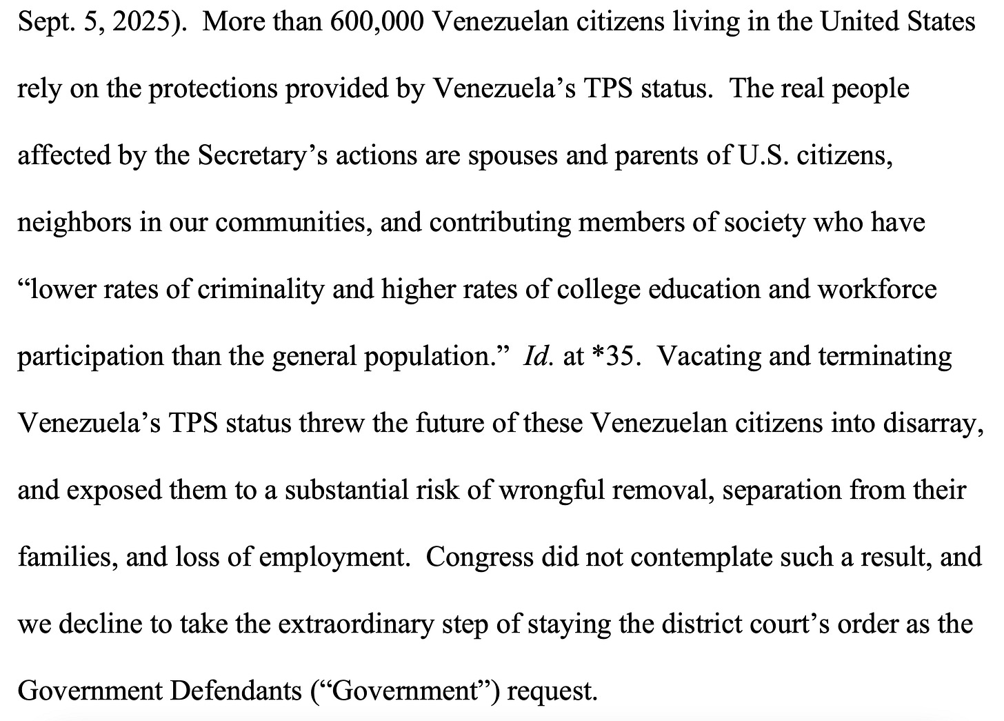 The district court denied a motion to stay the effect of its final order, and last week the Ninth Circuit also denied an application to stay the lower court order. So, once again, the district court and the Ninth Circuit have combined to extend the TPS for Venezuelans until October 2026 unless the Supreme Court intervenes with regard to this final order as it did on the preliminary order.